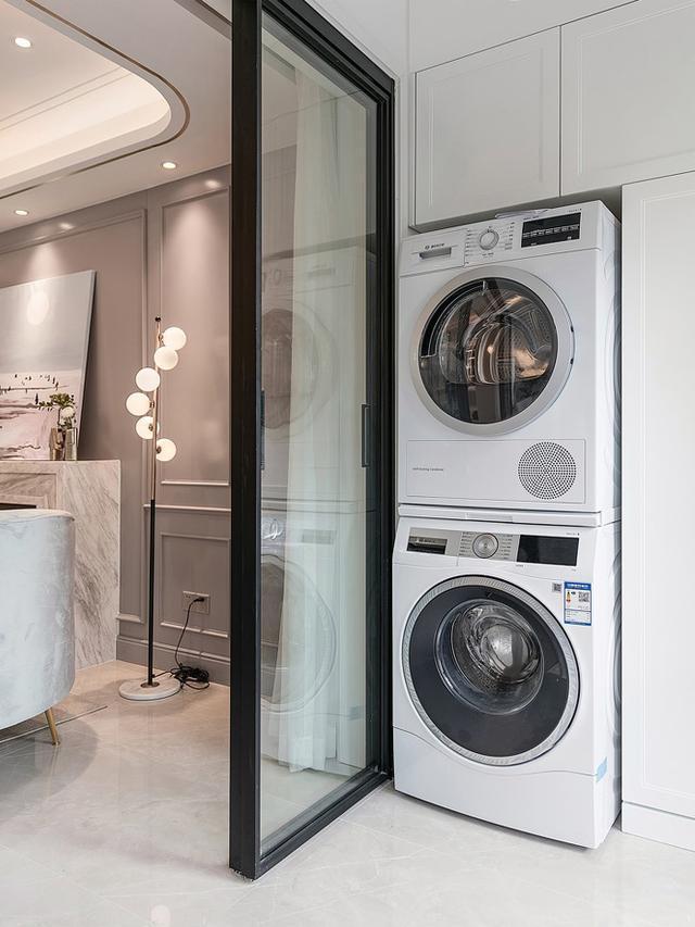 陽臺不再只是晾衣服的地方,要解決晾衣服的問題,可以選擇烘干機,這樣陽臺上就不用掛滿衣服了,擺放洗衣機的地方,定制定制一個洗衣機柜,把洗衣機嵌入進去,洗衣機柜上方空間,也可以利用來儲物,增加收納空間,好看又實用!